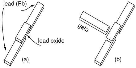 Josephson junctions: Brian Josephson won a Nobel prize for his 1962 prediction of the Josepheson junction. A Josephson junction is a pair of superconductors bridged by a thin insulator, as in Figure below (a), through which electrons can tunnel. The first Josephson junctions were lead superconductors bridged by an insulator. These days a tri-layer of aluminum and niobium is preferred. Electrons can tunnel through the insulator even with zero voltage applied across the superconductors.