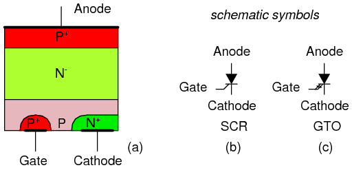 The schematic symbols for an SCR and GTO are shown in Figures above (b & c). The basic diode symbol indicates that cathode to anode conduction is unidirectional like a diode. The addition of a gate lead indicates control of diode conduction. The gate turn off switch (GTO) has bidirectional arrows about the gate lead, indicating that the conduction can be disabled by a negative pulse, as well as initiated by a positive pulse.