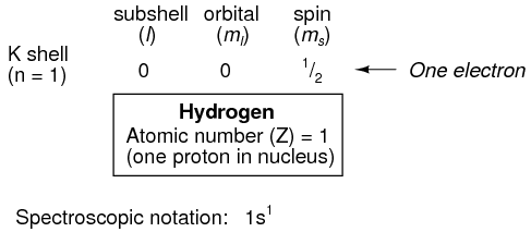 With one proton in the nucleus, it takes one electron to electrostatically balance the atom (the proton's positive electric charge exactly balanced by the electron's negative electric charge). This one electron resides in the lowest shell (n=1), the first subshell (l=0), in the only orbital (spatial orientation) of that subshell (ml=0), with a spin value of 1/2. A common method of describing this organization is by listing the electrons according to their shells and subshells in a convention called spectroscopic notation. In this notation, the shell number is shown as an integer, the subshell as a letter (s,p,d,f), and the total number of electrons in the subshell (all orbitals, all spins) as a superscript. Thus, hydrogen, with its lone electron residing in the base level, is described as 1s1.