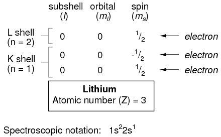 Often, when the spectroscopic notation is given for an atom, any shells that are completely filled are omitted, and the unfilled, or the highest-level filled shell, is denoted. For example, the element neon (shown in the previous illustration), which has two completely filled shells, may be spectroscopically described simply as 2p6 rather than 1s22s22p6. Lithium, with its K shell completely filled and a solitary electron in the L shell, may be described simply as 2s1 rather than 1s22s1.