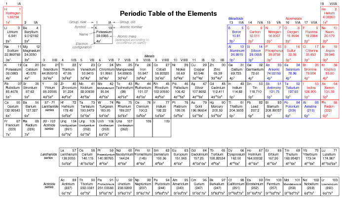 Since elements with identical electron configurations in their outermost shell(s) exhibit similar chemical properties, Dmitri Mendeleev organized the different elements in a table accordingly. Such a table is known as a periodic table of the elements, and modern tables follow this general form in Figure below.