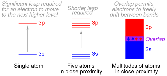 When atoms combine to form substances, the outermost shells, subshells, and orbitals merge, providing a greater number of available energy levels for electrons to assume. When large numbers of atoms are close to each other, these available energy levels form a nearly continuous band wherein electrons may move as illustrated in Figure below