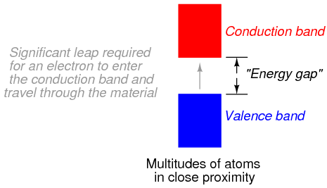Band overlap will not occur in all substances, no matter how many atoms are close to each other. In some substances, a substantial gap remains between the highest band containing electrons (the so-called valence band) and the next band, which is empty (the so-called conduction band). See Figure below. As a result, valence electrons are “bound” to their constituent atoms and cannot become mobile within the substance without a significant amount of imparted energy. These substances are electrical insulators.