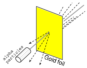 Rutherford's scattering experiment involved bombarding a thin gold foil with positively charged alpha particles as in Figure below. Young graduate students H. Geiger and E. Marsden experienced unexpected results. A few Alpha particles were deflected at large angles. A few Alpha particles were back-scattering, recoiling at nearly 180o. Most of the particles passed through the gold foil undeflected, indicating that the foil was mostly empty space. The fact that a few alpha particles experienced large deflections indicated the presence of a minuscule positively charged nucleus.