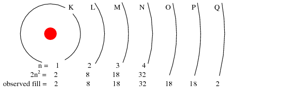 Electron shells in an atom were formerly designated by letter rather than by number. The first shell (n=1) was labeled K, the second shell (n=2) L, the third shell (n=3) M, the fourth shell (n=4) N, the fifth shell (n=5) O, the sixth shell (n=6) P, and the seventh shell (n=7) Q.