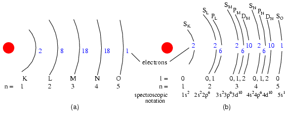 (a) Bohr representation of Silver atom, (b) Subshell representation of Ag with division of shells into subshells (angular quantum number l). This diagram implies nothing about the actual position of electrons, but represents energy levels.