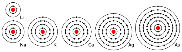 Periodic table group IA elements: Li, Na, and K, and group IB elements: Cu, Ag, and Au have one electron in the outer, or valence, shell, which is readily donated. Inner shell electrons: For n= 1, 2, 3, 4; 2n2 = 2, 8, 18, 32.