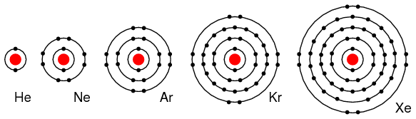 Group VIIIA elements: He, Ne, Ar, Kr, Xe all have 8 electrons in the valence shell. (Figure below) That is, the valence shell is complete meaning these elements neither donate nor accept electrons. Nor do they readily participate in chemical reactions since group VIIIA elements do not easily combine with other elements. In recent years chemists have forced Xe and Kr to form a few compounds, however for the purposes of our discussion this is not applicable. These elements are good electrical insulators and are gases at room temperature.