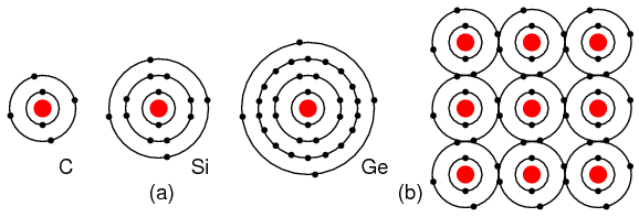 Group IVA elements: C, Si, Ge, having 4 electrons in the valence shell as shown in Figure below form compounds by sharing electrons with other elements without forming ions. This shared electron bonding is known as covalent bonding. Note that the center atom (and the others by extension) has completed its valence shell by sharing electrons. Note that the figure is a 2-d representation of bonding, which is actually 3-d. It is this group, IVA, that we are interested in for its semiconducting properties.