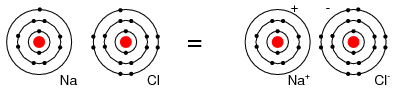 Neutral Sodium atom donates an electron to neutral Chlorine atom forming Na+ and Cl- ions.