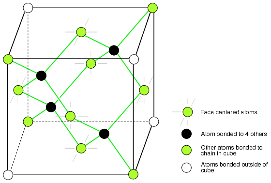 The diamond unit cell is the basic crystal building block. Figure below shows four atoms (dark) bonded to four others within the volume of the cell. This is equivalent to placing one of Figure above(b) at the origin in Figure below, then placing three more on adjacent faces to fill the full cube. Six atoms fall on the middle of each of the six cube faces, showing two bonds. The other two bonds to adjacent cubes were omitted for clarity. Out of eight cube corners, four atoms bond to an atom within the cube. Where are the other four atoms bonded? The other four bond to adjacent cubes of the crystal. Keep in mind that even though four corner atoms show no bonds in the cube, all atoms within the crystal are bonded in one giant molecule. A semiconductor crystal is built up from copies of this unit cell.