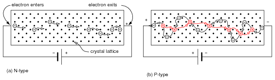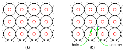 The crystal is effectively one molecule. An atom covalent bonds to four others, which in turn bond to four others, and so on. The crystal lattice is relatively stiff resisting deformation. Few electrons free themselves for conduction about the crystal. A property of semiconductors is that once an electron is freed, a positively charged empty space develops which also contributes to conduction.