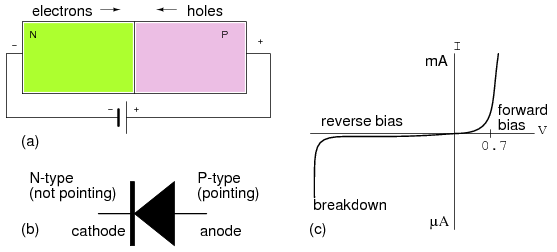 The SPICE (simulation program, integrated circuit emphesis) electronic simulation program provides circuit elements and models for semiconductors. The SPICE element names begin with d, q, j, or m correspond to diode, BJT, JFET and MOSFET elements, respectively. These elements are accompanied by corresponding “models” These models have extensive lists of parameters describing the device. Though, we do not list them here. In this section we provide a very brief listing of simple spice models for semiconductors, just enough to get started. For more details on models and an extensive list of model parameters see Kuphaldt. [TRK] This reference also gives instructions on using SPICE.