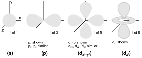 Orbitals: (s) Three fold symmetry. (p) Shown: px, one of three possible orientations (px, py, pz ), about their respective axes. (d) Shown: dx2-y2 similar to dxy, dyz, dxz. Shown: dz2. Possible d-orbital orientations: five.