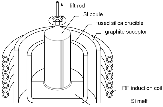 The polycrystalline silicon is melted in a fused silica crucible heated by an induction heated graphite suceptor. The graphite heater may alternately be directly driven by a low voltage at high current. In the Czochralski process, the silicon melt is solidified on to a pencil sized monocrystal silicon rod of the desired crystal lattice orientation. (Figure below) The rod is rotated and pulled upward at a rate to encourage the diameter to expand to several inches. Once this diameter is attained, the boule is automatically pulled at a rate to maintain a constant diameter to a length of a few feet. Dopants may be added to the crucible melt to create, for example, a P-type semiconductor. The growing apparatus is enclosed within an inert atmosphere.