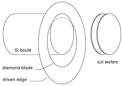 The finished boule is ground to a precise final diameter, and the ends trimmed. The boule is sliced into wafers by an inside diameter diamond saw. The wafers are ground flat and polished. The wafers could have an N-type epitaxial layer grown atop the wafer by thermal deposition for higher quality. Wafers at this stage of manufacture are delivered by the silicon wafer manufacturer to the semiconductor manufacturer.