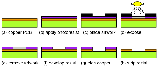 We start with a copper foil laminated to an epoxy fiberglass board in Figure above (a). We also need positive artwork with black lines corresponding to the copper wiring lines and pads that are to remain on the finished board. Positive artwork is required because positive acting resist is used. Though, negative resist is available for both circuit boards and semiconductor processing. At (b) the liquid positive photo resist is applied to the copper face of the printed circuit board (PCB). It is allowed to dry and may be baked in an oven. The artwork may be a plastic film positive reproduction of the original artwork scaled to the required size. The artwork is placed in contact with the circuit board under a glass plate at (c). The board is exposed to ultraviolet light (d) to form a latent image of softened photo resist. The artwork is removed (e) and the softened resist washed away by an alkaline solution (f). The rinsed and dried (baked) circuit board has a hardened resist image atop the copper lines and pads that are to remain after etching. The board is immersed in the etchant (g) to remove copper not protected by hardened resist. The etched board is rinsed and the resist removed by a solvent.