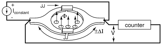 A constant current bias is forced across the ring in parallel with both Josephson junctions in Figure below. The current divides equally between the two junctions in the absence of an applied magnetic field and no voltage is developed across across the ring. [JBc] While any value of Magnetic flux (Φ) may be applied to the SQUID, only a quantized value (a multiple of the flux quanta) can flow through the opening in the superconducting ring.[JBa] If the applied flux is not an exact multiple of the flux quanta, the excess flux is cancelled by a circulating current around the ring which produces a fractional flux quanta. The circulating current will flow in that direction which cancels any excess flux above a multiple of the flux quanta. It may either add to, or subtract from the applied flux, up to ±(1/2) a flux quanta. If the circulating current flows clockwise, the current adds to the top Josepheson junction and subtracts from the lower one. Changing applied flux linearly causes the circulating current to vary as a sinusoid.[JBb] This can be measured as a voltage across the SQUID. As the applied magnetic field is increased, a voltage pulse may be counted for each increase by a flux quanta.[HYP]