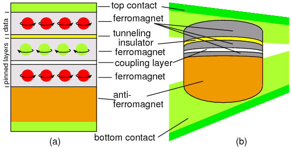 A simple magnetic tunnel junction (MTJ) is shown in Figure below (a), consisting of a pair of ferromagnetic, strong magnetic properties like iron (Fe), layers separated by a thin insulator. Electrons can tunnel through a sufficiently thin insulator due to the quantum mechanical properties of electrons– the wave nature of electrons. The current flow through the MTJ is a function of the magnetization, spin polarity, of the ferromagnetic layers. The resistance of the MTJ is low if the magnetic spin of the top layer is in the same direction (polarity) as the bottom layer. If the magnetic spins of the two layers oppose, the resistance is higher. [WJG]