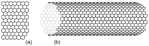 (a) Graphene: A single sheet of the graphite allotrope of carbon. The atoms are arranged in a hexagonal pattern with a carbon at each intersection. (b) Carbon nanotube: A rolled-up sheet of graphene.