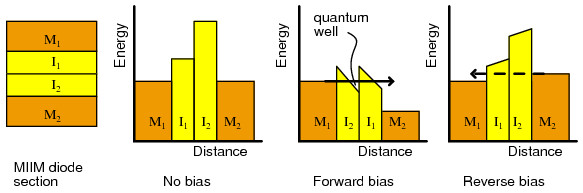 Metal insulator insulator metal (MIIM) diode: Cross section of diode. Energy levels for no bias, forward bias, and reverse bias. After Figure 1 [PHI].
