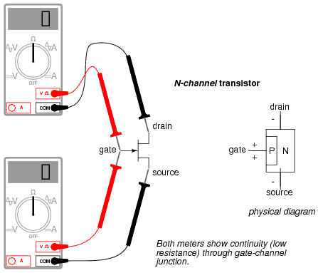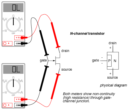 Testing continuity through the drain-source channel is another matter, though. Remember from the last section how a stored charge across the capacitance of the gate-channel PN junction could hold the JFET in a pinched-off state without any external voltage being applied across it? This can occur even when you're holding the JFET in your hand to test it! Consequently, any meter reading of continuity through that channel will be unpredictable, since you don't necessarily know if a charge is being stored by the gate-channel junction. Of course, if you know beforehand which terminals on the device are the gate, source, and drain, you may connect a jumper wire between gate and source to eliminate any stored charge and then proceed to test source-drain continuity with no problem. However, if you don't know which terminals are which, the unpredictability of the source-drain connection may confuse your determination of terminal identity.
