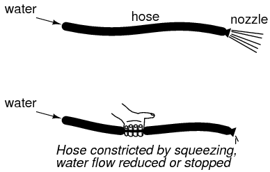 With no voltage applied between gate and source, the channel is a wide-open path for electrons to flow. However, if a voltage is applied between gate and source of such polarity that it reverse-biases the PN junction, the flow between source and drain connections becomes limited, or regulated, just as it was for bipolar transistors with a set amount of base current. Maximum gate-source voltage "pinches off" all current through source and drain, thus forcing the JFET into cutoff mode. This behavior is due to the depletion region of the PN junction expanding under the influence of a reverse-bias voltage, eventually occupying the entire width of the channel if the voltage is great enough. This action may be likened to reducing the flow of a liquid through a flexible hose by squeezing it: with enough force, the hose will be constricted enough to completely block the flow.