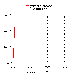 Like the BJT, the JFET tends to regulate the controlled current at a fixed level above a certain power supply voltage, no matter how high that voltage may climb. Of course, this current regulation has limits in real life -- no transistor can withstand infinite voltage from a power source -- and with enough drain-to-source voltage the transistor will "break down" and drain current will surge. But within normal operating limits the JFET keeps the drain current at a steady level independent of power supply voltage. To verify this, we'll run another computer simulation, this time sweeping the power supply voltage (V1) all the way to 50 volts:
