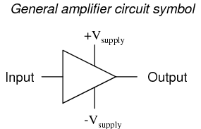 For ease of drawing complex circuit diagrams, electronic amplifiers are often symbolized by a simple triangle shape, where the internal components are not individually represented. This symbology is very handy for cases where an amplifier's construction is irrelevant to the greater function of the overall circuit, and it is worthy of familiarization: