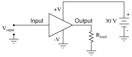 The +V and -V connections denote the positive and negative sides of the DC power supply, respectively. The input and output voltage connections are shown as single conductors, because it is assumed that all signal voltages are referenced to a common connection in the circuit called ground. Often (but not always!), one pole of the DC power supply, either positive or negative, is that ground reference point. A practical amplifier circuit (showing the input voltage source, load resistance, and power supply) might look like this: