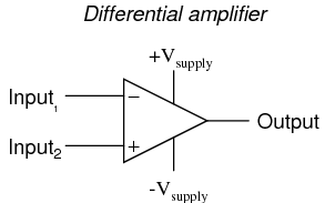 The two input leads can be seen on the left-hand side of the triangular amplifier symbol, the output lead on the right-hand side, and the +V and -V power supply leads on top and bottom. As with the other example, all voltages are referenced to the circuit's ground point. Notice that one input lead is marked with a (-) and the other is marked with a (+). Because a differential amplifier amplifies the difference in voltage between the two inputs, each input influences the output voltage in opposite ways. Consider the following table of input/output voltages for a differential amplifier with a voltage gain of 4: