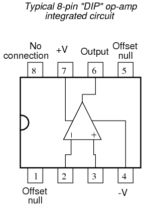 On single op-amps such as the 741 and 3130, the offset null connection points are pins 1 and 5 on the 8-pin DIP package. Other models of op-amp may have the offset null connections located on different pins, and/or require a slightly difference configuration of trim potentiometer connection. Some op-amps don't provide offset null pins at all! Consult the manufacturer's specifications for details.