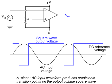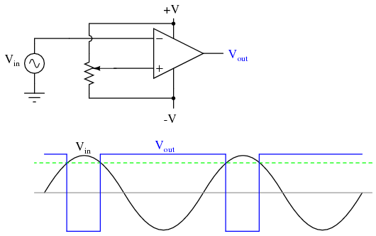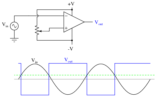 Another application for the comparator circuit shown is a square-wave converter. Suppose that the input voltage applied to the inverting (-) input was an AC sine wave rather than a stable DC voltage. In that case, the output voltage would transition between opposing states of saturation whenever the input voltage was equal to the reference voltage produced by the potentiometer. The result would be a square wave:
