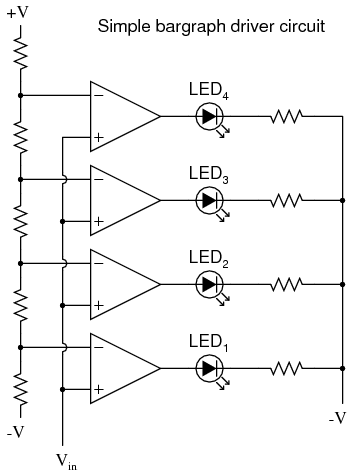 Another comparator application is that of the bargraph driver. If we had several op-amps connected as comparators, each with its own reference voltage connected to the inverting input, but each one monitoring the same voltage signal on their noninverting inputs, we could build a bargraph-style meter such as what is commonly seen on the face of stereo tuners and graphic equalizers. As the signal voltage (representing radio signal strength or audio sound level) increased, each comparator would "turn on" in sequence and send power to its respective LED. With each comparator switching "on" at a different level of audio sound, the number of LED's illuminated would indicate how strong the signal was.