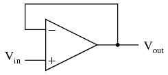 If we connect the output of an op-amp to its inverting input and apply a voltage signal to the noninverting input, we find that the output voltage of the op-amp closely follows that input voltage (I've neglected to draw in the power supply, +V/-V wires, and ground symbol for simplicity):