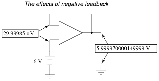 One great advantage to using an op-amp with negative feedback is that the actual voltage gain of the op-amp doesn't matter, so long as its very large. If the op-amp's differential gain were 250,000 instead of 200,000, all it would mean is that the output voltage would hold just a little closer to Vin (less differential voltage needed between inputs to generate the required output). In the circuit just illustrated, the output voltage would still be (for all practical purposes) equal to the non-inverting input voltage. Op-amp gains, therefore, do not have to be precisely set by the factory in order for the circuit designer to build an amplifier circuit with precise gain. Negative feedback makes the system self-correcting. The above circuit as a whole will simply follow the input voltage with a stable gain of 1.