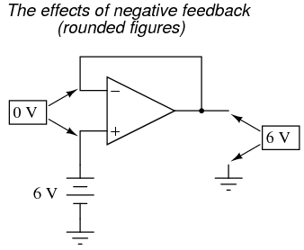 Because the op-amp's gain is so high, the voltage on the inverting input can be maintained almost equal to Vin. Let's say that our op-amp has a differential voltage gain of 200,000. If Vin equals 6 volts, the output voltage will be 5.999970000149999 volts. This creates just enough differential voltage (6 volts - 5.999970000149999 volts = 29.99985 µV) to cause 5.999970000149999 volts to be manifested at the output terminal, and the system holds there in balance. As you can see, 29.99985 µV is not a lot of differential, so for practical calculations, we can assume that the differential voltage between the two input wires is held by negative feedback exactly at 0 volts.