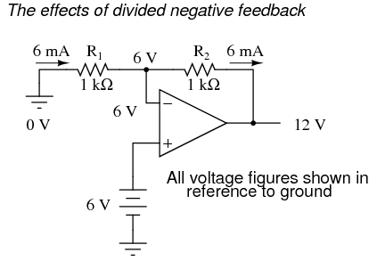 A helpful analogy for understanding divided feedback amplifier circuits is that of a mechanical lever, with relative motion of the lever's ends representing change in input and output voltages, and the fulcrum (pivot point) representing the location of the ground point, real or virtual.