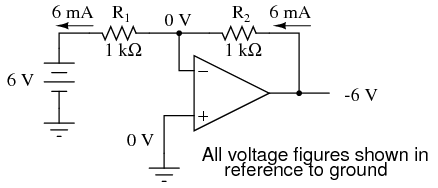 By grounding the noninverting input, the negative feedback from the output seeks to hold the inverting input's voltage at 0 volts, as well. For this reason, the inverting input is referred to in this circuit as a virtual ground, being held at ground potential (0 volts) by the feedback, yet not directly connected to (electrically common with) ground. The input voltage this time is applied to the left-hand end of the voltage divider (R1 = R2 = 1 kΩ again), so the output voltage must swing to -6 volts in order to balance the middle at ground potential (0 volts). Using the same techniques as with the noninverting amplifier, we can analyze this circuit's operation by determining current magnitudes and directions, starting with R1, and continuing on to determining the output voltage.