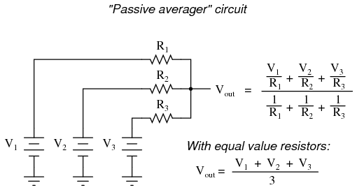 If we take three equal resistors and connect one end of each to a common point, then apply three input voltages (one to each of the resistors' free ends), the voltage seen at the common point will be the mathematical average of the three.