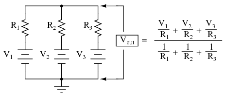 This circuit is really nothing more than a practical application of Millman's Theorem: