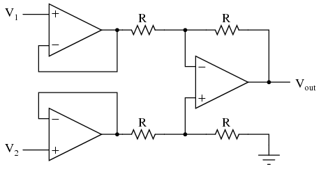 Now the V1 and V2 input lines are connected straight to the inputs of two voltage-follower op-amps, giving very high impedance. The two op-amps on the left now handle the driving of current through the resistors instead of letting the input voltage sources (whatever they may be) do it. The increased complexity to our circuit is minimal for a substantial benefit.