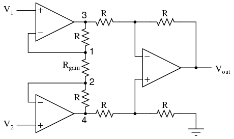 This intimidating circuit is constructed from a buffered differential amplifier stage with three new resistors linking the two buffer circuits together. Consider all resistors to be of equal value except for Rgain. The negative feedback of the upper-left op-amp causes the voltage at point 1 (top of Rgain) to be equal to V1. Likewise, the voltage at point 2 (bottom of Rgain) is held to a value equal to V2. This establishes a voltage drop across Rgain equal to the voltage difference between V1 and V2. That voltage drop causes a current through Rgain, and since the feedback loops of the two input op-amps draw no current, that same amount of current through Rgain must be going through the two "R" resistors above and below it. This produces a voltage drop between points 3 and 4 equal to: