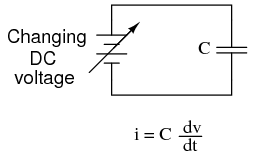 The dv/dt fraction is a calculus expression representing the rate of voltage change over time. If the DC supply in the above circuit were steadily increased from a voltage of 15 volts to a voltage of 16 volts over a time span of 1 hour, the current through the capacitor would most likely be very small, because of the very low rate of voltage change (dv/dt = 1 volt / 3600 seconds). However, if we steadily increased the DC supply from 15 volts to 16 volts over a shorter time span of 1 second, the rate of voltage change would be much higher, and thus the charging current would be much higher (3600 times higher, to be exact). Same amount of change in voltage, but vastly different rates of change, resulting in vastly different amounts of current in the circuit.