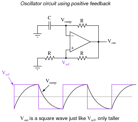 With their incredibly high differential voltage gains, op-amps are prime candidates for a phenomenon known as feedback oscillation. You've probably heard the equivalent audio effect when the volume (gain) on a public-address or other microphone amplifier system is turned too high: that high pitched squeal resulting from the sound waveform "feeding back" through the microphone to be amplified again. An op-amp circuit can manifest this same effect, with the feedback happening electrically rather than audibly.