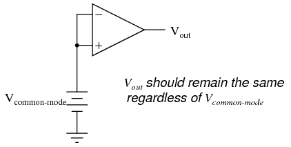 Voltage that is common between either of the inputs and ground, as "Vcommon-mode" is in this case, is called common-mode voltage. As we vary this common voltage, the perfect differential amplifier's output voltage should hold absolutely steady (no change in output for any arbitrary change in common-mode input). This translates to a common-mode voltage gain of zero.