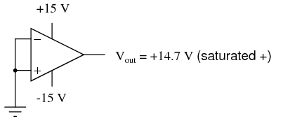 A perfect op-amp would output exactly zero volts with both its inputs shorted together and grounded. However, most op-amps off the shelf will drive their outputs to a saturated level, either negative or positive. In the example shown above, the output voltage is saturated at a value of positive 14.7 volts, just a bit less than +V (+15 volts) due to the positive saturation limit of this particular op-amp. Because the offset in this op-amp is driving the output to a completely saturated point, there's no way of telling how much voltage offset is present at the output. If the +V/-V split power supply was of a high enough voltage, who knows, maybe the output would be several hundred volts one way or the other due to the effects of offset!