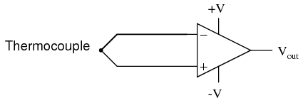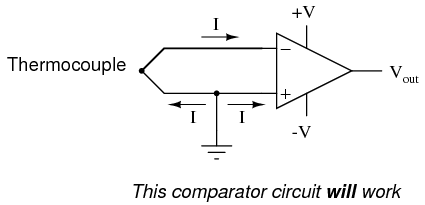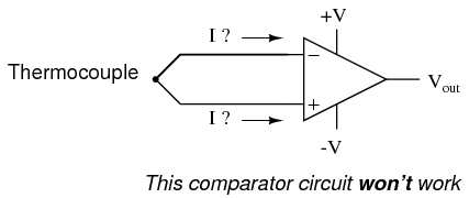 At first glance, we see no apparent problems with this circuit. A thermocouple, generating a small voltage proportional to temperature (actually, a voltage proportional to the difference in temperature between the measurement junction and the "reference" junction formed when the alloy thermocouple wires connect with the copper wires leading to the op-amp) drives the op-amp either positive or negative. In other words, this is a kind of comparator circuit, comparing the temperature between the end thermocouple junction and the reference junction (near the op-amp). The problem is this: the wire loop formed by the thermocouple does not provide a path for both input bias currents, because both bias currents are trying to go the same way (either into the op-amp or out of it).