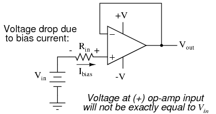 We expect a voltage follower circuit such as the one above to reproduce the input voltage precisely at the output. But what about the resistance in series with the input voltage source? If there is any bias current through the noninverting (+) input at all, it will drop some voltage across Rin, thus making the voltage at the noninverting input unequal to the actual Vin value. Bias currents are usually in the microamp range, so the voltage drop across Rin won't be very much, unless Rin is very large. One example of an application where the input resistance (Rin) would be very large is that of pH probe electrodes, where one electrode contains an ion-permeable glass barrier (a very poor conductor, with millions of Ω of resistance).