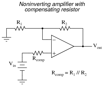 One way to do so is based on the assumption that the two input bias currents will be the same. In reality, they are often close to being the same, the difference between them referred to as the input offset current. If they are the same, then we should be able to cancel out the effects of input resistance voltage drop by inserting an equal amount of resistance in series with the other input, like this: